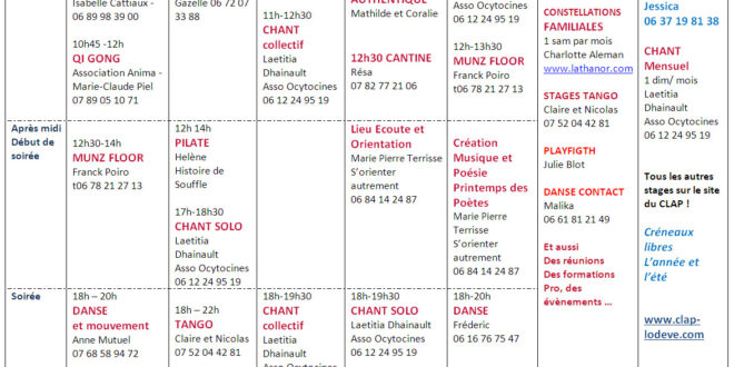 Salles à LOUER pour les ateliers et stages Jessica 06 37 19 81 38 Planning des activités de la semaine au CLAP : tous les détails ici https://clap-lodeve.com/fr/category/activites/ cliquez sur l’image pour l’agrandir Toute la semaine CHANT cours particuliers sur rdv Laetitia Dhainault asso ocytocines – 06 12 24 95 …