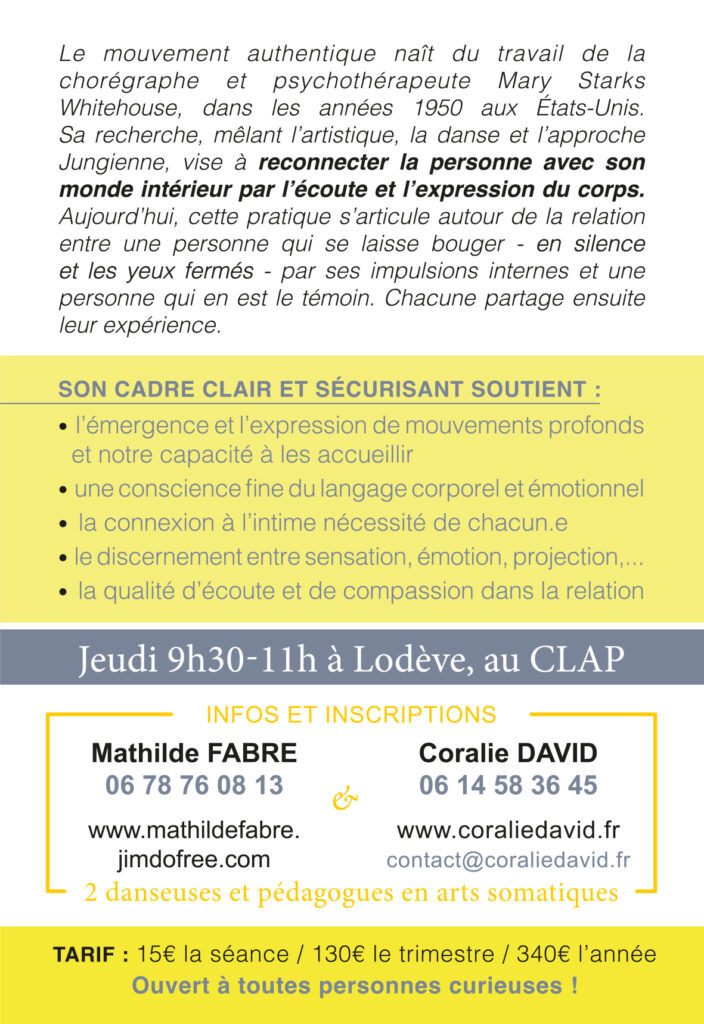 Nous sommes ravies de partager la pratique (savoureuse) du mouvement authentique. Rejoignez-nous, les séances du 18 et 25 septembre sont à prix libre, pour essayer et se faire une idée par l’expérience ; ).
